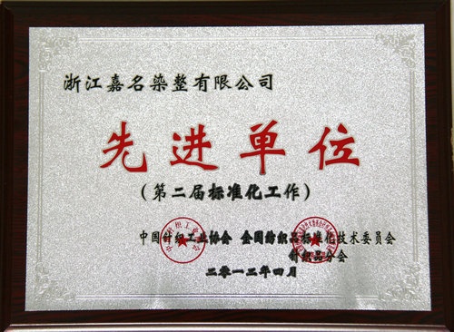 2012年4月,浙江嘉名染整有限公司被中國針織工業(yè)協(xié)會、全國紡織品標(biāo)準(zhǔn)化技術(shù)委員會針織品分會評為第二屆標(biāo)準(zhǔn)化工作先進(jìn)單位。